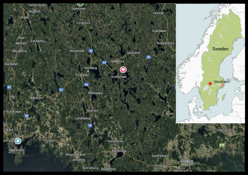 Het huis ligt op slechts 600 meter van het meer Sörälgen – met zijn 14 kilometer lengte het grootste meer van de gemeente Hällefors – en op 20 minuten rijden van het dorp Hällefors.